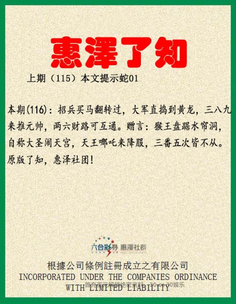 【惠泽了知】116期:招兵买马翻转过,解战肖虎狗马牛。大军直捣到黄龙,解明肖龙,大肖牛虎马羊狗猪。三八九来推元帅,两六财路可互通。赠言:猴王盘踞水帘洞,自称大圣闹天宫,天王哪吒来降服,三番五次皆不从。