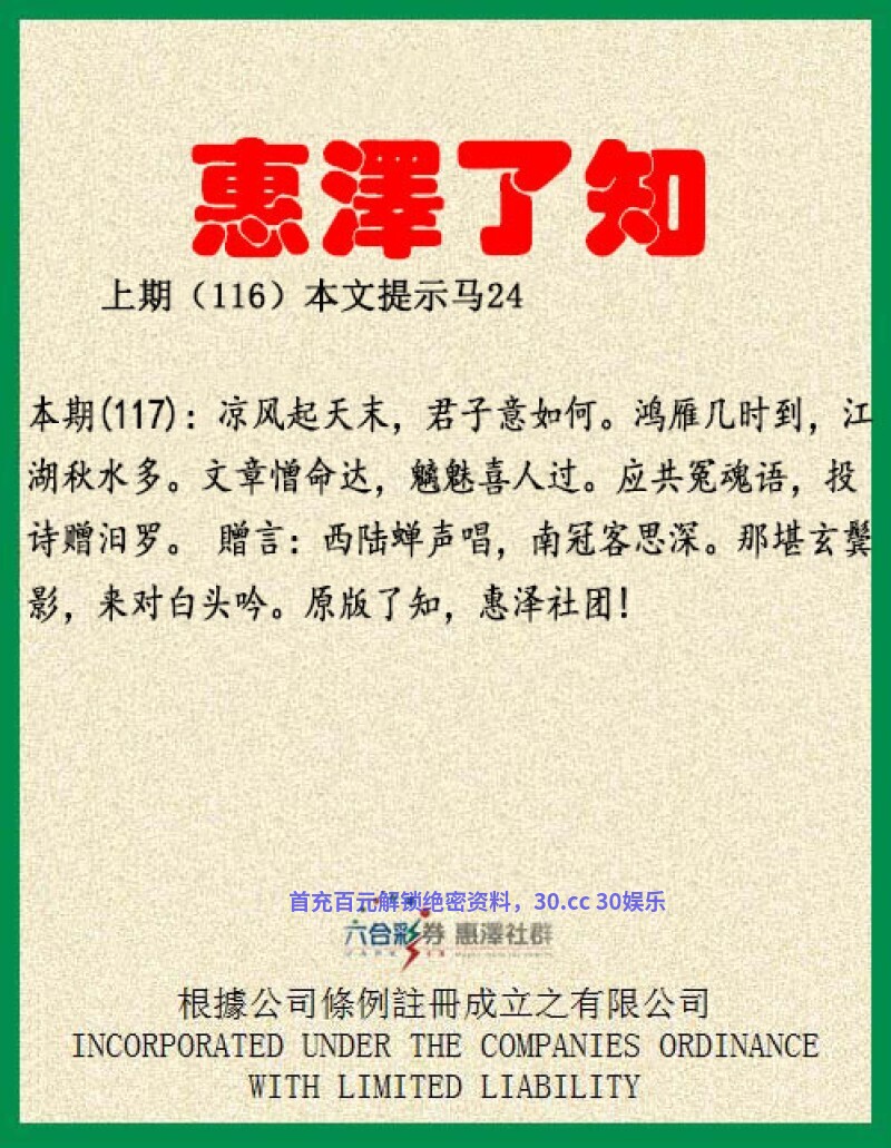 【惠泽了知】117期:凉风起天末,君子意如何。鸿雁几时到,江湖秋水多。文章憎命达,魑魅喜人过。应共冤魂语,投诗赠汨罗。贈言:西陆蝉声唱,南冠客思深。那堪玄鬓影,来对白头吟。本期诗文出自出自唐代杜甫的《天末怀李白》,诗文意思是:从天边吹来阵阵凉风,天边解天肖:牛兔龙马猴猪。你现在的心境怎么样呢?不知道我的书信你何时才能收到?只恐江湖险恶,秋水多风浪。解凶丑肖:鼠牛虎猴狗猪。创作诗文最忌讳坦荡的命途,奸佞小人最希望好人犯错误。奸佞小人解奸肖鼠龙。你与沉冤的屈子同命运,应投诗于汨罗江诉说冤屈与不平。