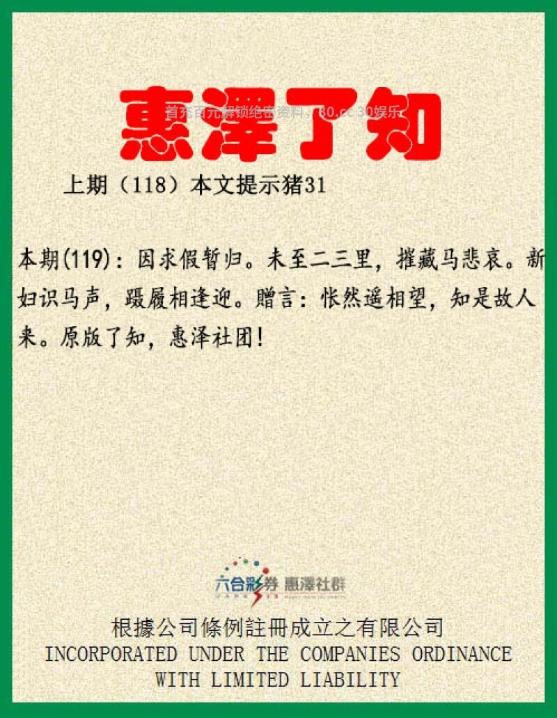 【惠泽了知】119期:因求假暂归。未至二三里,解23羊,二三位肖牛虎马羊。摧藏马悲哀。新妇识马声,蹑履相逢迎。解女肖兔蛇羊鸡猪。贈言:怅然遥相望,知是故人来。